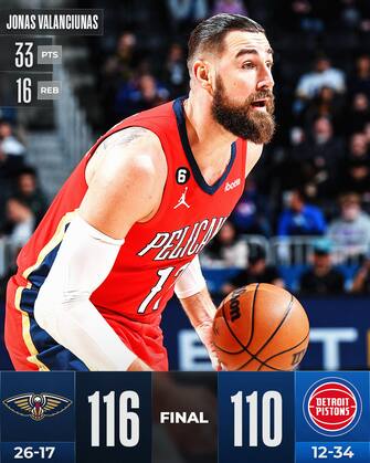 Coach Casey lamenta soprattutto la mancanza di corpi da opporre sotto canestro a Jonas Valanciunas, dominatore del match con 33 punti e 16 rimbalzi tirando 11/12 da due punti e 1/3 da tre con 8/10 ai liberi in meno di 30 minuti. “Abbiamo cominciato la stagione con cinque centri e ora ce ne è rimasto uno” ha detto il coach di Detroit, che ha allenato il lituano a Toronto. “Conosco Jonas da quando era un cucciolo: è un animale diverso dagli altri, sotto canestro è incontenibile”. Per New Orleans ci sono anche i 19 a testa di McCollum e Murphy