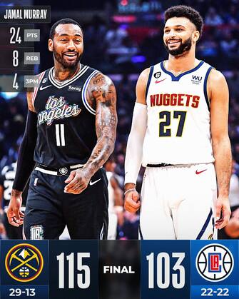 L.A. CLIPPERS-DENVER NUGGETS 115-103 | Prova di forza gigantesca dei Nuggets che vincono nettamente a L.A. contro i Clippers anche senza Nikola Jokic, fermato da un problema a un polso. Jamal Murray segna 24 punti e Michael Porter Jr. ne aggiunge 22 in una serata da 50% al tiro per i primi in classifica a Ovest, acuendo ulteriormente la crisi dei Clippers che non riescono a vendicare il -31 di settimana scorsa sul campo dei Nuggets. Sempre senza Paul George, a L.A. non bastano i 24 di Kawhi Leonard per evitare il settimo ko nelle ultime otto