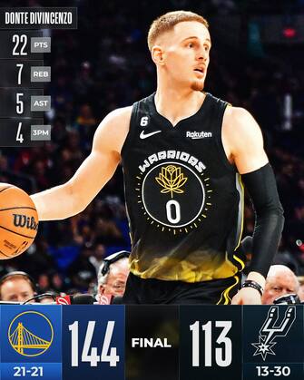 SAN ANTONIO SPURS-GOLDEN STATE WARRIORS 113-144 | Gli Spurs celebrano il loro 50° compleanno con una partita speciale all’Alamodome, chiamando a raccolta ben 68.323 spettatori (nuovo record nella storia della NBA), ma Golden State non si fa intimorire e firma il suo massimo stagionale per punti, vincendo grazie ai 25 ì di Jordan Poole e i 22 di Donte DiVincenzo (massimo in stagione). Ai padroni di casa non bastano i 21 di Tre Jones per evitare la quarta sconfitta in fila, ma anche sotto di 30 il pubblico fa la "ola" per 5 minuti di fila
