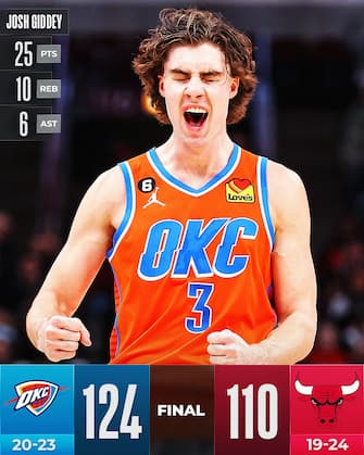 CHICAGO BULLS-OKLAHOMA CITY THUNDER 110-124 | Continua l’ottimo momento di OKC, che da quando è cominciato il 2023 ha un record di 5-2 ed è ora a mezza gara di distanza dal decimo posto a Ovest. Chicago ancora senza DeRozan va sotto di 18 ma si riporta in corsa con un parziale di 18-5 nel terzo quarto, salvo poi essere ricacciata indietro dai tre ventellisti di OKC: Josh Giddey ne mette 25 con 10 rimbalzi, Shai Gilgeous-Alexander ne aggiunge 21 e Jalen Williams ne mette 22, mentre non bastano i 25 di Zach LaVine (5/19 al tiro)