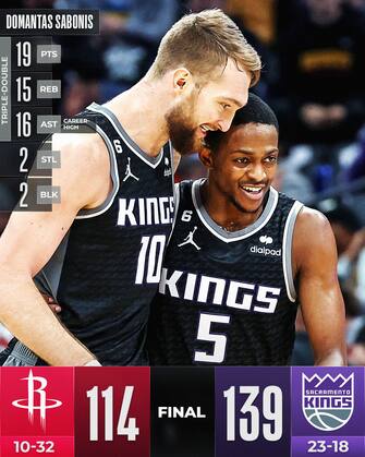 Il centro lituano firma una tripla doppia da 19 punti, 15 rimbalzi e 16 assist (massimo in carriera), numeri che nella storia della NBA ha realizzato solamente 16 giocatori prima di oggi di cui solo due erano centri, ovverosia Wilt Chamberlain e Nikola Jokic. È lui il motore di un attacco che chiude con il 55% dal campo e un eccellente 20/40 da tre, mentre la buona notizia per Houston sono i 27 punti realizzati da Jabari Smith Jr., alla sua miglior prestazione stagionale, mentre Jalen Green ne mette 25 nel primo tempo per poi realizzarne solo 2 nella ripresa