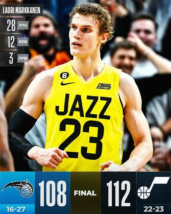 UTAH JAZZ-ORLANDO MAGIC 112-108 | Jazz e Magic danno vita a una partita divertente e combattutissima, risolta solamente dalla stoppata decisiva di Lauri Markkanen sulla tripla di Franz Wagner che avrebbe potuto dare il pareggio ai suoi a 5 secondi dalla fine. Pur senza tentare neanche un tiro nel primo quarto Markkanen chiude come miglior marcatore dei suoi a quota 28, accompagnato dai 23 di Clarkson e dai 18 di Sexton, ai cui due errori dalla lunetta a 12 secondi dalla fine pone rimedio un rimbalzo offensivo cruciale di Walker Kessler, partito titolare