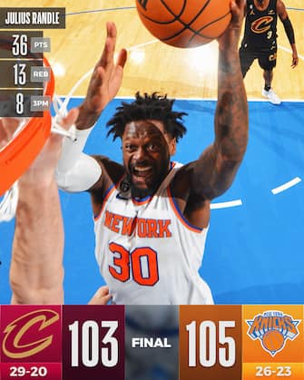 NEW YORK KNICKS-CLEVELAND CAVALIERS 105-103 | Tornano al successo dopo quattro sconfitte i Knicks, che fermano la corsa dei Cavaliers e di Donovan Mitchell - che in estate poteva arrivare a New York, ma alla fine ha scelto Cleveland: per lui 24 punti con 24 tiri, otto assist e otto rimbalzi (al rientro dall’infortunio), impreciso però nelle ultime tre conclusioni e fermato anche dai crampi sul possesso decisivo che poteva valere il potenziale pareggio. Non bastano poi i 24 e 12 rimbalzi di Jarrett Allen e i 22 punti di Darius Garland