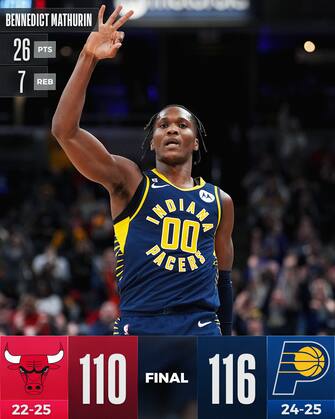 INDIANA PACERS-CHICAGO BULLS 116-110 | Indiana interrompe la peggior striscia stagionale di sette sconfitte in fila, rimontando il -21 accumulato nel primo tempo guidata dai 26 punti a testa di Myles Turner (che aggiunge anche sette rimbalzi) e di Ben Mathurin, che dà la scossa ai compagni e firma il canestro del definitivo sorpasso a 29 secondi dalla sirena. Per i Pacers è l’undicesimo successo in rimonta dopo aver toccato la doppia cifra di svantaggio in questa stagione, il secondo partendo da -20 e oltre