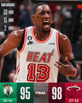 MIAMI HEAT-BOSTON CELTICS 98-95 | Prestazione da All-Star per Bam Adebayo, protagonista assoluto della vittoria Heat in volata sui Celtics e autore del jumper del sorpasso a 20.4 secondi dalla sirena, ciliegina sulla torta di una prestazione da 30 punti e 15 rimbalzi - arma letale con cui Miami piazza il 15-0 di parziale nel quarto periodo, risalendo da -10 e mandando in tilt l’attacco di Boston, inchiodato a 13 punti nell’ultima frazione (il dato peggiore dell’intera stagione per la miglior squadra NBA)