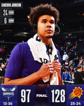 PHOENIX SUNS-CHARLOTTE HORNETS 128-97 | Gara di parziali vinta senza grande affanno dai Suns che prima toccano le 30 lunghezze di vantaggio a metà secondo quarto, si fanno in parte rimontare e poi chiudono i conti con una ripresa da 70 punti: per Phoenix sono quattro vittorie in fila con 14 punti e 11 assist di Chris Paul che guida un roster con ben sei giocatori in doppia cifra, mentre dall’altra parte non bastano i 19 punti con 7/21 al tiro di Terry Rozier e poco altro (per Charlotte è la settima sconfitta nelle ultime nove)