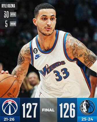 DALLAS MAVERICKS-WASHINGTON WIZARDS 126-127 | Kyle Kuzma segna 30 punti e realizza uno dei due tiri liberi a sua disposizione a 4.2 secondi dalla sirena per portare avanti Washington di una decisiva lunghezza nel match, con Luka Doncic che sul possesso successivo non riesce a servire Spencer Dinwiddie dopo essere stato raddoppiato, perde il pallone e condanna Dallas al settimo ko nelle ultime nove. Niente Kristaps Porzingins in campo causa infortunio, che manca così al primo ritorno in Texas da avversario