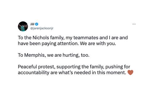 I giocatori dei Grizzlies non hanno parlato né prima né dopo la partita. L'unico a esporsi sui social è stato Jaren Jackson Jr., che ha esteso le sue condoglianze alla famiglia a nome di tutta la squadra. "Memphis, stiamo soffrendo anche noi. Proteste pacifhce, supporto alla famiglia, spinta perché ci sia responsabilità è quello che serve in questo momento"