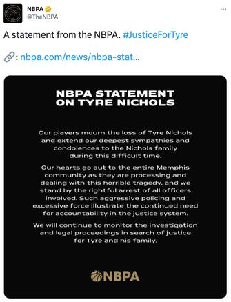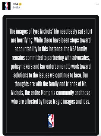 Chris Paul, ex capo dell'associazione giocatori, ha scritto questo su Twitter: "Il cambiamento è necessario a tutti i livelli e noi dobbiamo fare la nostra parte. Non possiamo perdere la nostra umanità come società. Alla famiglia Nichols e alla comunità di Memphis: il mio cuore è con voi stasera"