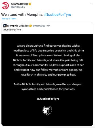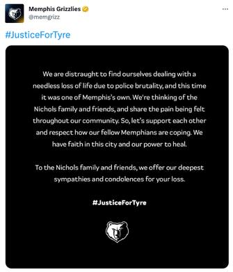 "La morte insensata di Tyre Nichols ci ha colpiti duramente" sono state le parole di coach Taylor Jenkins. "Vorrei poter abbracciare la famiglia in questo momento, stanno affrontando un periodo durissimo. La città di Memphis sta affrontando un momento ben peggiore di quello della nostra squadra. Sono orgoglioso che i ragazzi abbiano giocato oggi. Siamo scesi in campo col cuore pesante, ma abbiamo giocato per la nostra città"