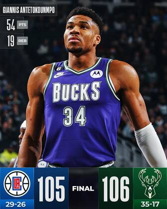 A fine gara sono 54 i punti realizzati da Antetokounmpo, più della metà dei 106 messi a referto dai suoi, a cui aggiunge anche 19 rimbalzi e 2 assist tirando 21/39 dal campo, 2/8 da tre e 10/15 ai liberi in 36 minuti. Giannis da solo segna più di Leonard (17), George (16) e Morris (16) messi assieme, i tre migliori titolari dei Clippers a cui si aggiungono i 26 dalla panchina di Norman Powell. Tra i Bucks chiudono in doppia cifra solo Khris Middleton (16) e il neo All-Star Jrue Holiday (12 con super difesa su Leonard nel finale)