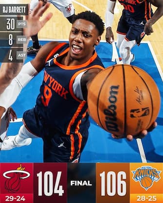 NEW YORK KNICKS-MIAMI HEAT 106-104 | Isaiah Hartenstein incide su entrambi i lati del campo nell’ultimo minuto - schiacciando il canestro del +3 e fermando l’attacco finale degli Heat - mentre al resto pensa un RJ Barrett da 30 punti che riscatta l’opaca prestazione contro i Lakers e regala una vittoria ai Knicks e a Julius Randle (23 punti e 10 rimbalzi); il modo migliore per festeggiare la sua convocazione all’All-Star Game e l’avvicinarsi al sesto posto virtuale a Est - distante una sola partita e l’ultimo a cui aggrapparsi per andare direttamente ai playoff