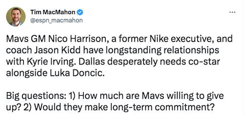 COSA PUÒ METTERE SUL PIATTO DALLAS PER ARRIVARE A KYRIE IRVING? | Sicuramente la vicinanza al giocatore da parte di Nico Harrison e Jason Kidd - entrambi molto legati a Kyrie Irving e persone di cui l’All-Star di Brooklyn si fida e che potrebbero convincerlo a cambiare aria. Il problema resta: quanto è disposta a cedere Dallas pur di metterlo sotto contratto? Complicato da ipotizzare, ma per i Mavericks appare come un punto di svolta inatteso e da cogliere al volo