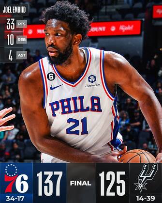 Joel Embiid (33 punti) è decisivo nel successo in trasferta dei Sixers a San Antonio, successo in rimonta anche per Portland (33 punti di Simons) che beffa a domicilio Washington e interrompe la striscia di sei successi Wizards. Boston incassa il quarto ko nelle ultime sei battuta in casa da Phoenix, maxi rissa e cinque espulsi nel match vinto in trasferta da Orlando a Minneapolis (11 punti per Paolo Banchero). Sacramento perde a Indianapolis, successi per Toronto, Atlanta e Detroit