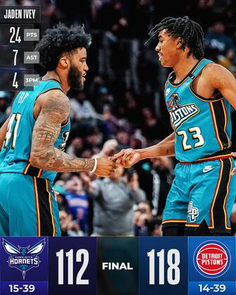 DETROIT PISTONS-CHARLOTTE HORNETS 118-112 | Nella sfida tra le due peggiori squadre a Est, sono i Pistons a spuntarla grazie al canestro spezza-parità di Saddiq Bey a 32 secondi dalla fine. Sono i suoi 22 punti insieme ai 24 di Jaden Ivey e i 21 di Bojan Bogdanovic a guidare i padroni di casa, tornati in campo dopo tre giorni passati sugli aerei per via del maltempo che ha impedito i loro spostamenti. Agli ospiti non bastano i 23 di un LaMelo Ball uscito nel finale per falli, con cinque errori ai liberi di Mason Plumlee negli ultimi sei minuti