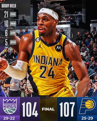 INDIANA PACERS-SACRAMENTO KINGS 107-104 | Il primo ritorno di Domantas Sabonis a Indianapolis sorride alla squadra di casa, che riesce a vincere la sfida grazie a un altro ex di serata come Buddy Hield. Il tiratore segna 21 punti per guidare i suoi, che rischiano di dilapidare 19 lunghezze di vantaggio ma resistono alla rimonta degli ospiti, privi di De’Aaron Fox per motivi personali. Sabonis chiude con 15 punti e 16 rimbalzi, dietro solo ai 23 di Harrison Barnes e i 16 di Kevin Huerter