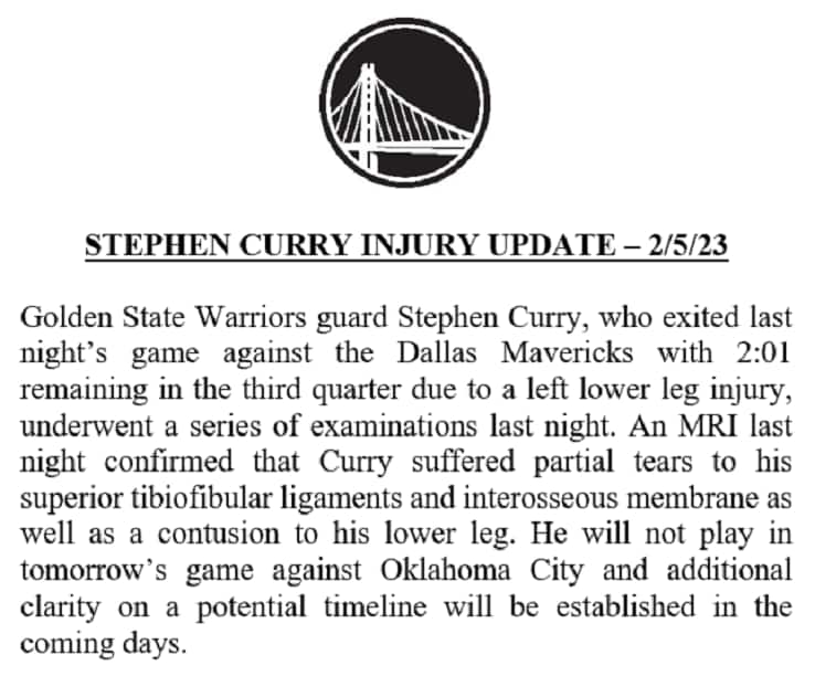 La risonanza magnetica per l'infortunio riportato dal n°30 di Golden State nella gara contro i Dallas Mavericks ha evidenziato la lesione a un legamento attorno alla tibia della gamba sinistra, confermando così la gravità del colpo subito da Curry. Salterà "diverse settimane" - riporta Shams Charania (anche se non è ancora chiaro quante) - dovendo dire addio anche all'All-Star Weekend di Salt Lake City in programma il prossimo weekend