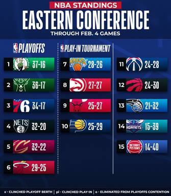 QUESTA LA CLASSIFICA DELLA EASTERN CONFERENCE A DUE MESI DALLA FINE DELLA REGULAR SEASON, CON LE SQUADRE VIRTUALMENTE QUALIFICATE PER I PLAYOFF E PER IL PLAY-IN
