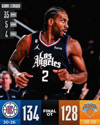 Dopo una gara saltata per malattia, Jalen Brunson ritrova il suo posto in quintetto e la vena realizzativa chiudendo con 41 punti sbagliando solo cinque dei 19 tiri tentati (5/7 dalla lunga distanza), accompagnato dai 28 con 11 rimbalzi e 7 assist dell’All-Star Julius Randle, i 14 di RJ Barrett (solo 6/21 al tiro) e i 13 di Quentin Grimes. Proprio quest’ultimo aveva dato ai Knicks il primo vantaggio della partita a 52 secondi dalla fine, ma nell’overtime i primi quattro punti realizzati dai Clippers hanno chiuso di fatto i conti