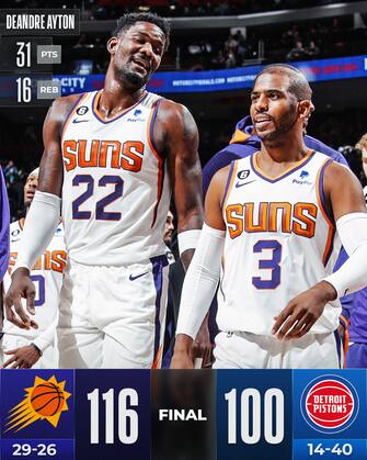 DETROIT PISTONS-PHOENIX SUNS 100-116 | Prosegue la risalita dei Suns che passano anche a Detroit e conquistano l’ottavo successo delle ultime dieci gare - speranzosi di rivedere finalmente Devin Booker sul parquet dopo settimane (assente dalla gara di Natale). Bastano due fiammate a inizio del primo e del terzo quarto per mettere le cose in chiaro, contro un avversario che continua a perdere e non va oltre i 25 punti in uscita dalla panchina di Saddiq Bey con 7/12 al tiro