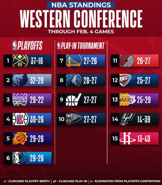 QUESTA LA CLASSIFICA DELLA WESTERN CONFERENCE A DUE MESI DALLA FINE DELLA REGULAR SEASON, CON LE SQUADRE VIRTUALMENTE QUALIFICATE PER I PLAYOFF E PER IL PLAY-IN