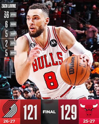 CHICAGO BULLS-PORTLAND TRAIL BLAZERS 129-121 | Il piano difensivo dei Bulls, cambiato più volte nel corso del match, fallisce miseramente nel provare a contenere Damian Lillard, che tuttavia però non riesce a segnare a sufficienza per evitare la sconfitta contro Chicago - che si gode i Big Three per una volta al loro meglio, in una sfida in cui è decisivo il terzo quarto da 33-17 di parziale in favore dei padroni di casa in una partita per i Bulls complessivamente da 60% al tiro (48/80) e condita con 32 assist