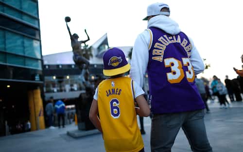 UN PASSAGGIO GENERAZIONALE | Quello da Kareem Abdul-Jabbar a LeBron James, ma anche quello dei tifosi che arrivano all'arena: il figlio (con la maglia n°6 di "King" James) mano nella mano col padre (con la maglia vintage n°33 di "The Captain", di cui si vede la statua sullo sfondo)