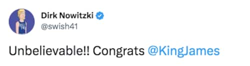 DIRK NOWITZKI | Una leggenda come il campione tedesco resta senza parole come tutto il resto del mondo davanti al compiersi della storia e al record di James - uno che di canestri se ne intende, presente nella top-10 all-time in NBA