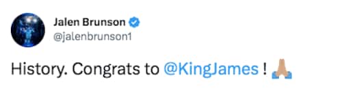 JALEN BRUNSON - NEW YORK KNICKS | Questa notte anche lui è sceso in campo con i suoi Knicks, ha raccolto 25 punti e il canestro decisivo per battere Orlando, ma come il resto del mondo NBA non ha voluto perdere occasione di condividere la sua gioia di fronte al compimento della storia