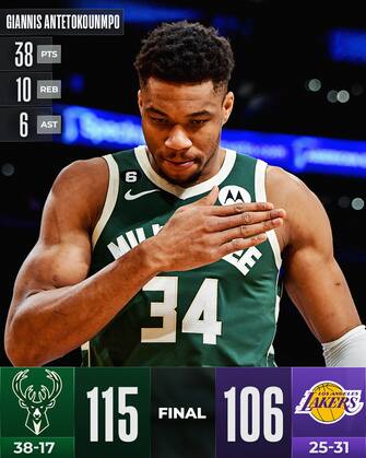 Giannis Antetokounmpo incanta contro i Lakers (38 punti) e trascina i Bucks al successo a Los Angeles, Brooklyn si gode il ritorno di Spencer Dinwiddie (25 punti) e batte Chicago nonostante i 38 punti di Zach LaVine, Phoenix senza gli infortunati Devin Booker e Kevin Durant cade ad Atlanta sotto i colpi di Trae Young (36 punti). Inciampano anche i Nuggets, battuti a Orlando nonostante i 37 punti di Aaron Gordon: Paolo Banchero chiude con 11 punti e 10 rimbalzi - uno dei sette giocatori in casa Magic in doppia cifra