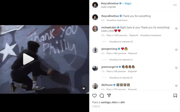 E proprio lì, allora, il giocatore ha voluto lasciare il suo ultimo ringraziamento alla città: cappuccio della felpa in testa, una maschera stile Anonymous sul viso e una bomboletta spray in mano, Thybulle è saltato su un cassonetto e ha aggiunto al fianco della sua immagine sul murale le parole "Thank you Philly", prima di allontanarsi in tutta velocità da Girard Avenue.