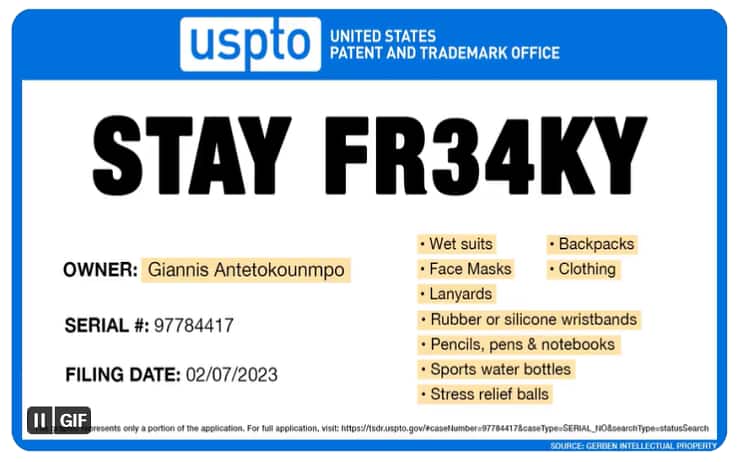 La superstar dei Bucks ha fatto richiesta di poter utilizzare in via esclusiva tre potenziali marchi registrati ("STAY FR34KY". "FR34K SHOW" e "UNSEEN FR34KY HOURS") costruiti attorno al suo amatissimo soprannome con cui è conosciuto. In ballo ci sono i (tanti) soldi legati al merchandising prodotto attorno al campione greco