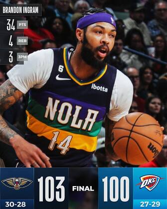 Il protagonista della vittoria di New Orleans è infatti un Brandon Ingram scatenato, capace di segnare 23 dei suoi 34 punti finali nel primo tempo, chiuso dagli ospiti sopra di 9 dopo essere stati avanti anche di 20 in una partenza razzo. Il n°14 chiude con 14/24 al tiro (e 3/5 da tre) raccogliendo i complimenti del suo allenatore: "Stasera è stato fenomenale". Bene anche l'esordio di Josh Richardson: 10 punti e ben 5 recuperi per lui