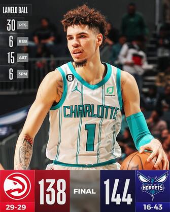 Tutti in palla quindi gli Hornets, ma il grande protagonista è LaMelo Ball, che resta in campo ben 41 minuti chiudendo con una super doppia doppia da 30 punti e 15 assist. LaMelo tira 12/19 dal campo (6/10 da tre), e cattura anche sei rimbalzi. Inutili per Atlanta i 25 punti con 14 assist di Trae Young e i 22 di Clint Capela.