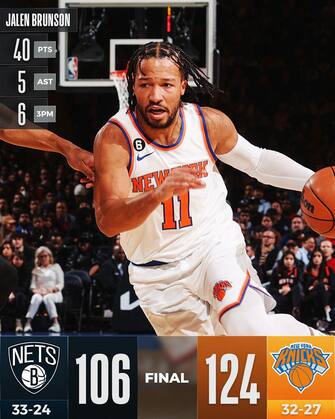 Terzo quarantello della stagione per Jalen Brunson, che trascina i Knicks soprattutto nel terzo quarto, quando segna 17 dei suoi 40 punti finali. Chiude sbagliando sei tiri in tutta la partita, con 15/21 dal campo (e un ottimo 6/9 dall'arco) con anche 5 assist e un +23 di plus/minus che la dice lunga sul suo impatto sulla gara