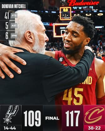 CLEVELAND CAVALIERS-SAN ANTONIO SPURS 117-109 | Due strisce che più lontane non potrebbero essere: i Cavs centrano la loro 7^ vittoria consecutiva infliggendo agli Spurs il loro 13° ko in fila (record di franchigia eguagliato). Se Mitchell è il protagonista, bene al suo fianco sia Jarrett Allen che Evan Mobley, entrambi in doppia doppia (17+11 rimbalzi per il primo, 15+10 per il secondo): un trio che nel primo tempo ha segnato 46 dei 65 punti di squadra. Il solito Keldon Johnson - a quota 25 - è il migliore per i texani