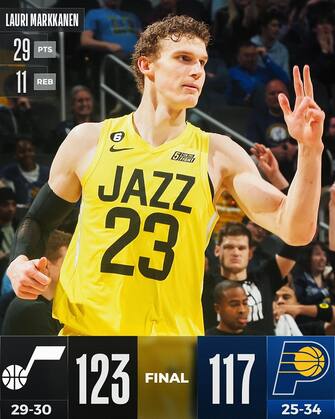 INDIANA PACERS-UTAH JAZZ 117-123 | Jordan Clarkson e Lauri Markkanen trascinano Jazz al successo in volata su Indiana con 29 punti a testa. Clarkson in particolare segna i canestri decisivi nel finale di partita e chiudendo con un fantastico 6/8 dall’arco. “Jordan era ‘in the zone’ stasera – ha detto il coach di Utah Will Hardy dopo la vittoria – quando è così dobbiamo solo essere bravi a creargli i giusti spazi in attacco”. Markkanen ai 29 punti aggiunge 11 rimbalzi.