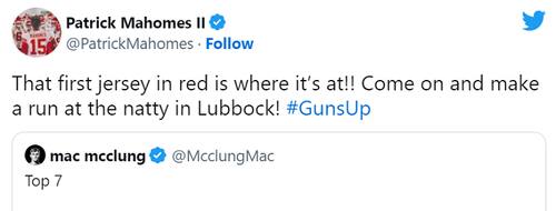 TUTTI VOGLIONO McCLUNG/3: PATRICK MAHOMES | Oggi il suo nome lo conoscete perché ha vinto due titoli NFL e due premi di MVP del Super Bowl (l'ultimo solo pochi giorni fa). Al tempo il quarterback dei Kansas City Chiefs però era anche il primo tifoso di McClung, e avrebbe fatto carte false pur di vederlo nella sua alma mater, ovvero l'università di Texas Tech. Ecco l'invito a "vestirsi di rosso" e a scegliere "Lubbock", Texas, la sede dei Red Raiders