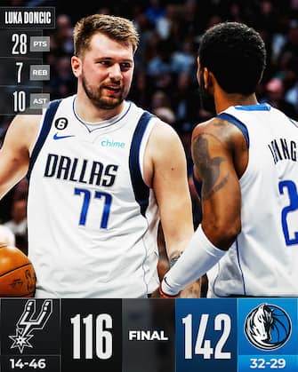 DALLAS MAVERICKS-SAN ANTONIO SPURS 142-116 | Prima vittoria per la coppia Doncic-Irving, che ha vita facile contro quello che rimane dei San Antonio Spurs — arrivati alla 15esima sconfitta consecutiva, peggior striscia nella storia della franchigia. Doncic ne mette 28 con 7 rimbalzi e 10 assist in tre quarti e Irving 23 per realizzare il massimo stagionale per punti della squadra di coach Kidd, interrompendo una striscia di tre sconfitte in fila. La notizia migliore per gli Spurs sono i 23 punti del rookie Malaki Branham