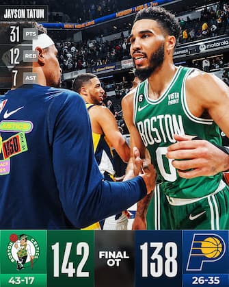 INDIANA PACERS-BOSTON CELTICS 138-142 OT | Pacers e Celtics danno vita a un match da 14 parità e 14 avvicendamenti nella guida del punteggio, deciso solamente dopo un tempo supplementare da quattro punti consecutivi di Jayson Tatum, spezzando la parità a quota 138 nell’ultimo minuto di gioco. Boston si conferma come la miglior squadra in trasferta della lega (19-10 il record) vincendo una partita con intensità da playoff nella quale gli attacchi viaggiano stabilmente sopra il 50% di realizzazione