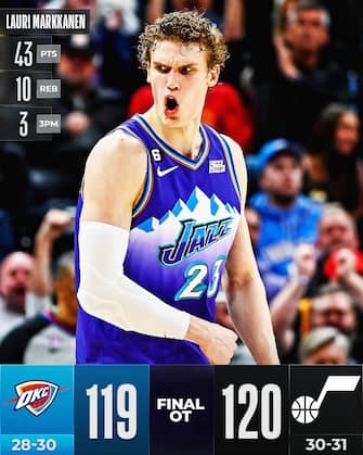Markkanen fa quello che ci si aspetta da un All-Star, risultando decisivo con i suoi 43 punti e 10 rimbalzi (5 in attacco) con 15/28 al tiro e un perfetto 10/10 dalla lunetta, risolvendo il match in favore dei suoi. Jordan Clarkson ne mette 24, ma soprattutto Kessler chiude con 7 punti, 18 rimbalzi e 7 stoppate in 37 minuti di gioco. Simone Fontecchio vede il campo per 14 minuti, ma segna solo uno degli 8 tiri tentati con 0/5 dalla lunga distanza