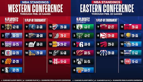 Questa la situazione nelle due conference alla ripresa della regular season dopo la pausa per l'All-Star Game. Oggi su Sky in replica c'è la vittoria dei Lakers sui Golden State Warriors con il commento di Francesco Bonfardeci e Mauro Bevacqua