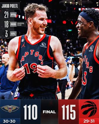 TORONTO RAPTORS-NEW ORLEANS PELICANS 115-110 | Sesta vittoria nelle ultime sette per i Raptors, che superano i Pacers in volata grazie a uno sforzo di squadra. Pascal Siakam è il migliore dei suoi con 26 punti ma è il “neo” arrivato Jakob Poeltl a fare la differenza con 21 punti e 18 rimbalzi (massimo in carriera) trovando il terzo successo su quattro gare da quando è tornato l’austriaco