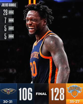 NEW YORK KNICKS-NEW ORLEANS PELICANS 128-106 | “Nozze d’oro” a 50 anni di distanza dal titolo conquistato dai Knicks nel 1973, con il Madison Square Garden che rende onore a quei campioni e poi gli attuali giocatori che dominano contro New Orleans e vincono un match mai in discussione - guidati dai 28 punti di Julius Randle, dai 25 di RJ Barrett e dai 20 di Jalen Brunson. Quarto stop negli ultimi cinque match per i Pelicans, che non vanno oltre i 19 punti di Brandon Ingram e aspettano ancora il ritorno di Zion Williamson
