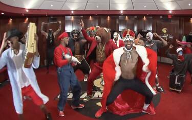 È uno dei video esilaranti più divertenti di sempre mai pubblicati da una squadra NBA: LeBron James e compagni, reduci dal primo titolo della loro carriera e pronti a prendersi qualche mese dopo anche il secondo, che si lanciano in questo ballo - l’Harlem Shake - ognuno indossando un travestimento diverso, sulle note di una canzone che ti entra in testa ma di cui, come ricorda l’account degli Heat, dopo 10 anni perdi i diritti di pubblicazione. Poco importa: il video in effetti è rende bene anche con senza audio