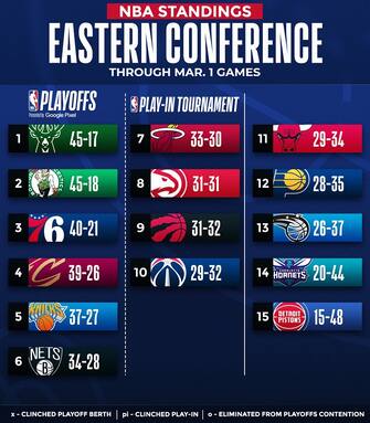 EASTERN CONFERENCE | Le classifiche aggiornate con la sitauzione playoff e play-in al momento