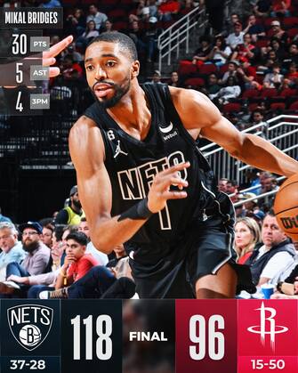 Continua la cavalcata di Mikal Bridges come miglior realizzatore, autore di 30 punti con 4/10 dall’arco e cinque assist - al terzo trentello in fila e al quinto da quando è sbarcato a Brooklyn un mese fa, sintomo di come abbia capito che ai Nets è diverso il ruolo che gli viene richiesto. Al resto pensano i 23 punti di Spencer Dinwiddie e i 18 con 13 rimbalzi di Nic Claxton: i Nets restano così sesta forza a Est, con l’intenzione di tenersi stretti un posto ai playoff