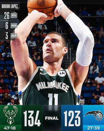 ORLANDO MAGIC-MILWAUKEE BUCKS 123-134 | Non si ferma la corsa in testa alla Eastern Conference dei Milwaukee Bucks, che anche senza l’influenzato Giannis Antetokounmpo e l’acciaccato Jrue Holiday battono a domicilio i Magic e conquistano la vittoria n°18 nelle ultime 19 gare. Merito dei 26 punti di Brook Lopez, dei 24 a testa di Jevon Carter e Khris Middleton (che nella prima da titolare del 2023 aggiunge anche 11 assist) e dei 16 punti e 11 rimbalzi di Bobby Portis