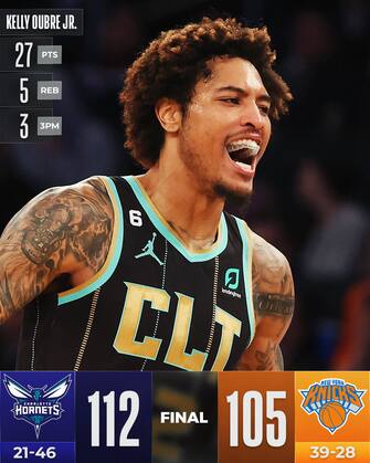NEW YORK KNICKS-CHARLOTTE HORNETS 105-112 | Si interrompe sul più bello la striscia di nove successi in fila dei Knicks, che perdono in casa contro Charlotte la partita che sembrava la più abbordabile di tutte: merito dei 27 punti di Kelly Oubre Jr e dei 25 di Terry Rozier, mentre New York nel secondo tempo non va mai a bersaglio (39 punti tirando con meno del 30% dal campo): inutili le 16 lunghezze di margine accumulate in avvio, così come i 27 punti di RJ Barrett - miglior realizzatore di un quintetto tutto in doppia cifra