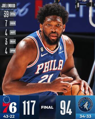 MINNESOTA TIMBERWOLVES-PHILADELPHIA 76ERS 94-117 | No Harden, no problem per Philadelphia che si sbarazza anche dei T’Wolves anche senza il Barba - fermato da un problema al piede sinistro. Minnesota va sotto nel secondo quarto (34-18 il parziale) e non riesce più a risalire nella ripresa, nonostante i tentativi di un Anthony Edwards unico in doppia cifra in quintetto e autore di 32 punti con 5/10 dall’arco e sette rimbalzi. Troppo poco per una squadra che sta scivolando pericolosamente in zona play-in